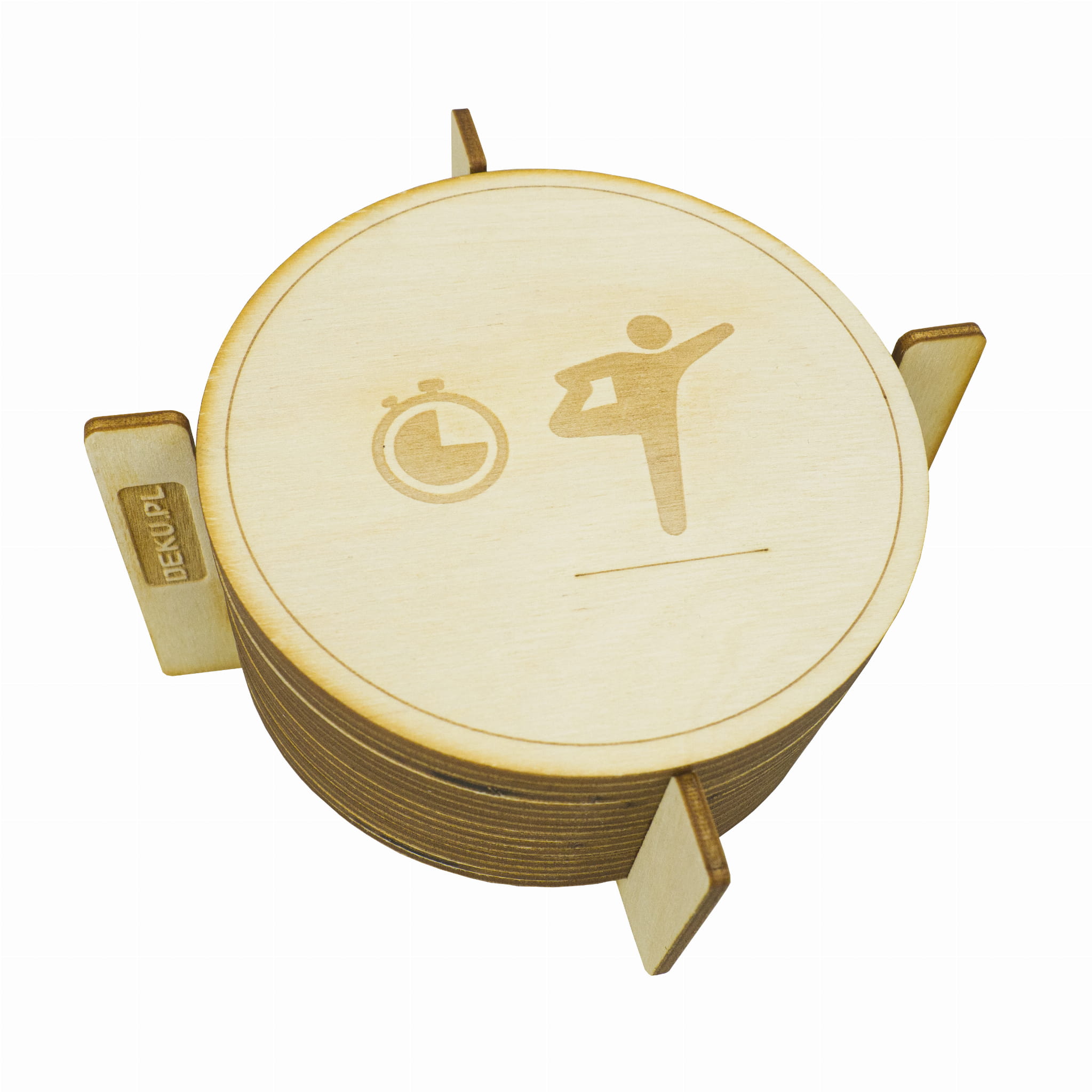 - W zestawie: okrągłe karty z ćwiczeniami, podstawka, jutowy woreczek