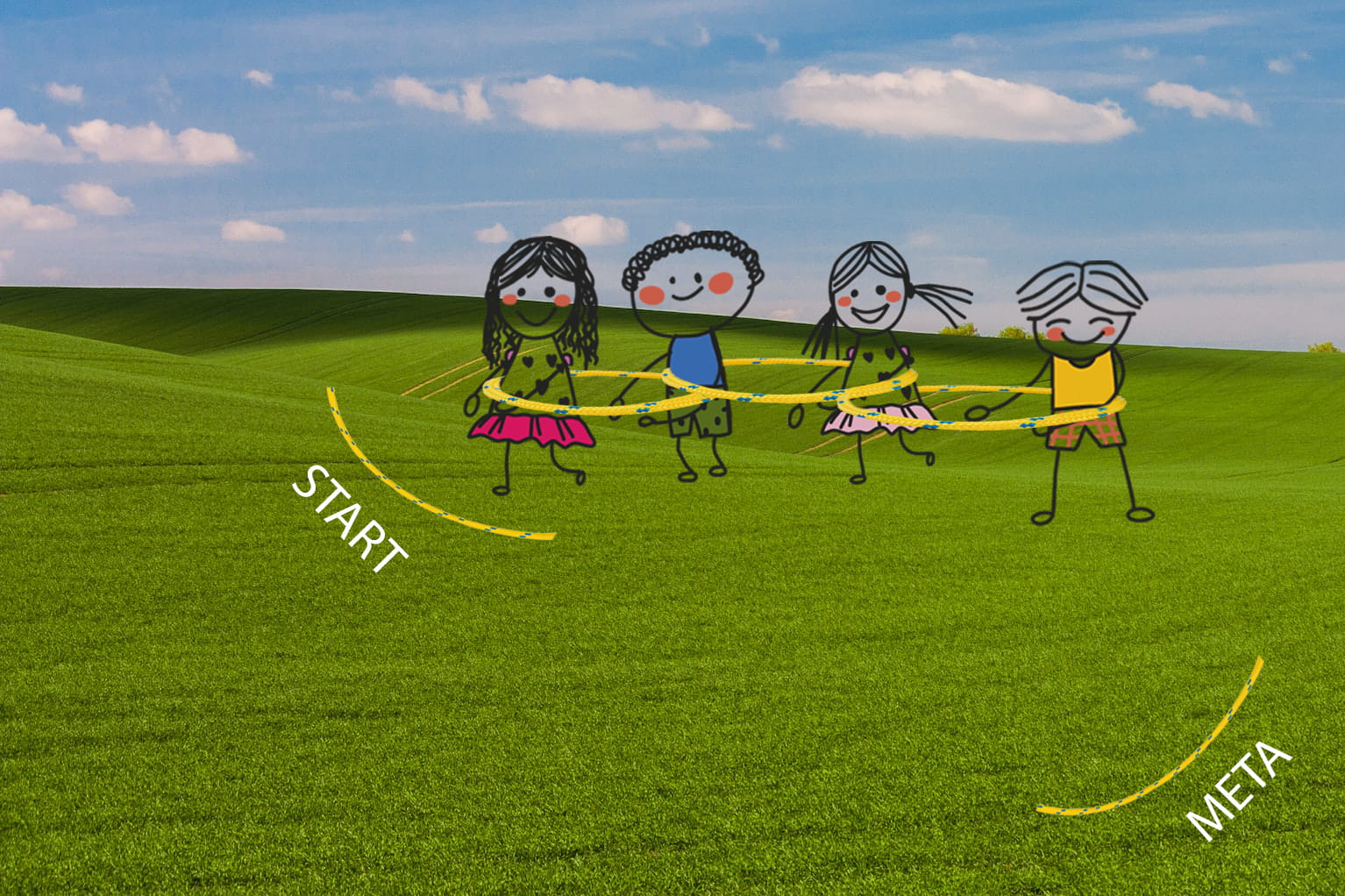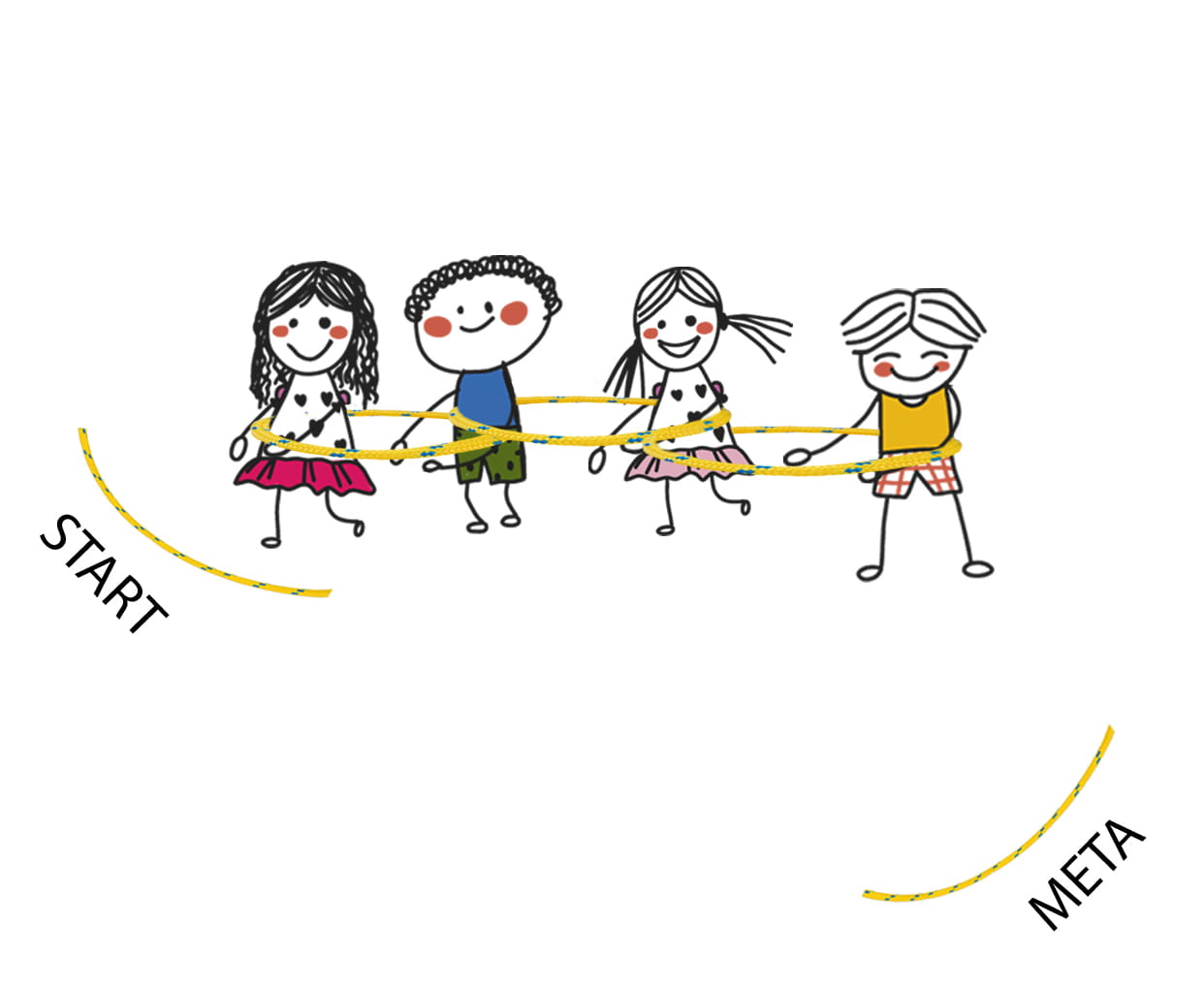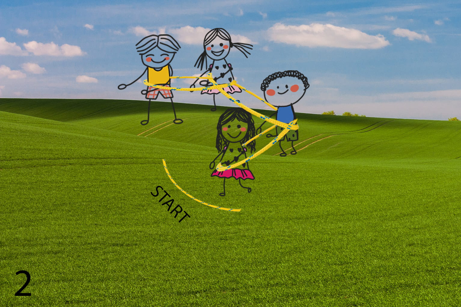 Kładziemy na start i metę - dwie krótkie liny zawarte w zestawie. Meta i start powinny być od siebie znacznie oddalone np. 10-20 m. Stajemy na starcie z całą drużyną w rzędzie, jeden za drugim. Każda z osób jest przepasana liną w pasie, tak aby każdy był ze sobą połączony.