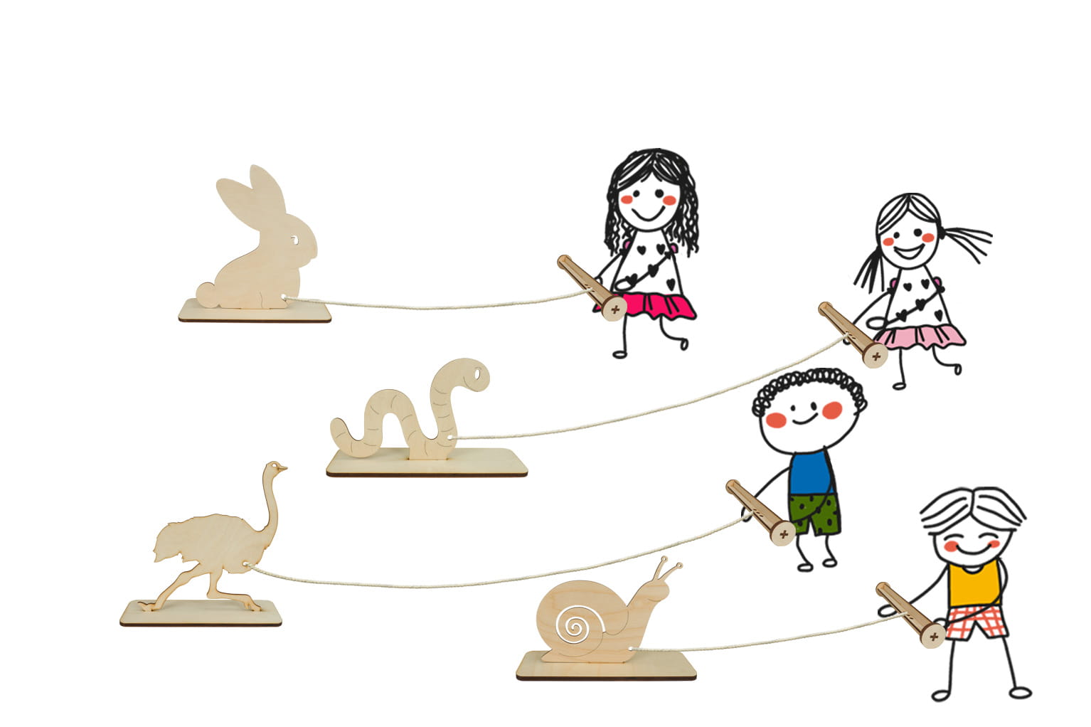 - W zestawie: 4 zwierzaków, sznurki oraz rączki do zwijania, Instrukcja